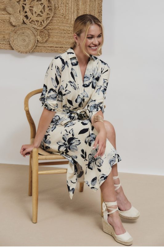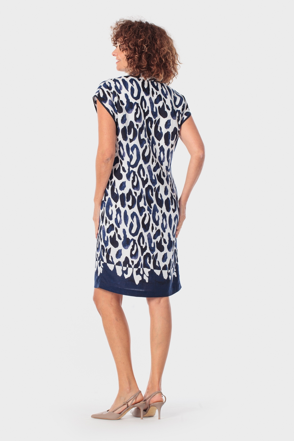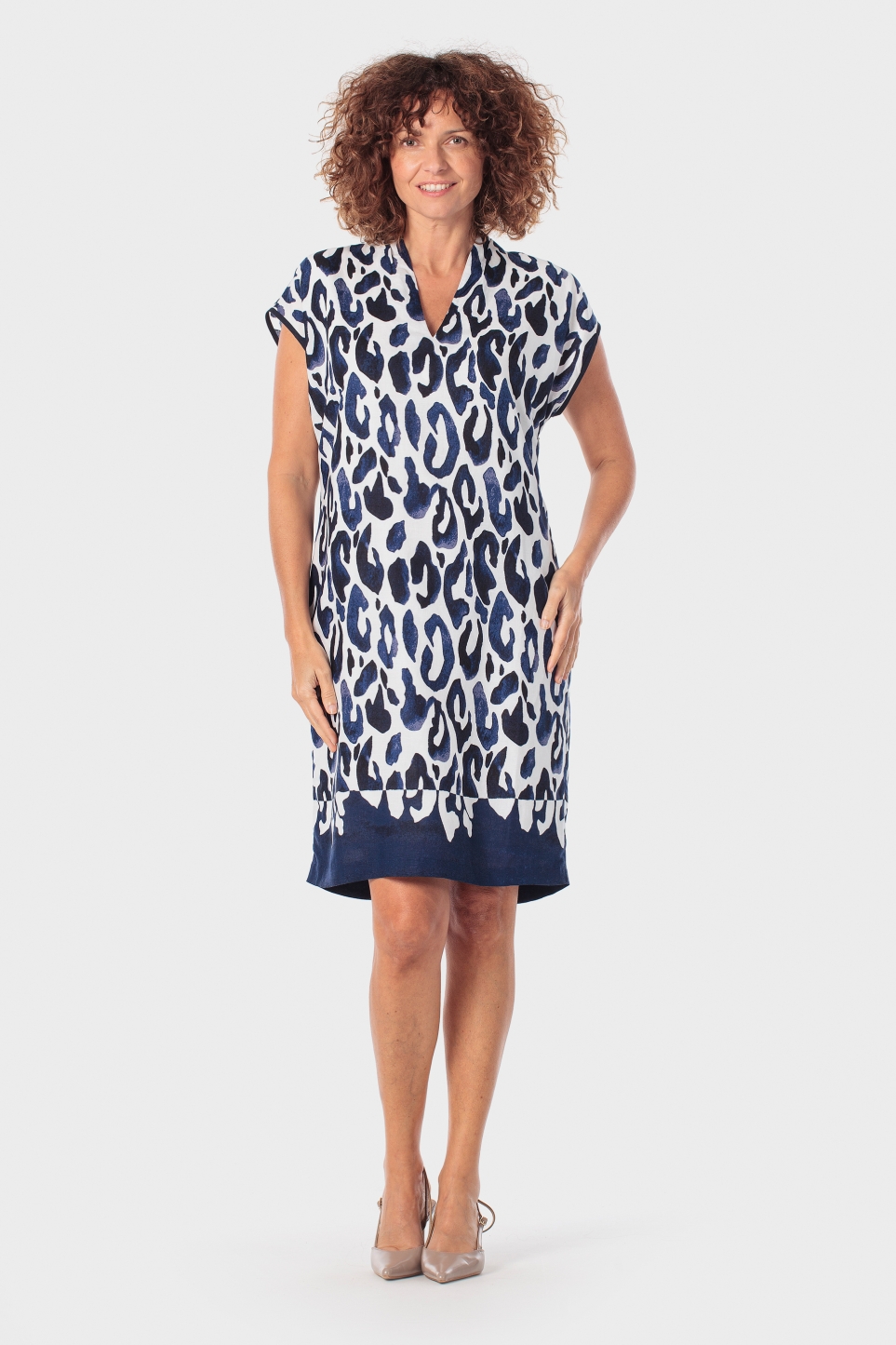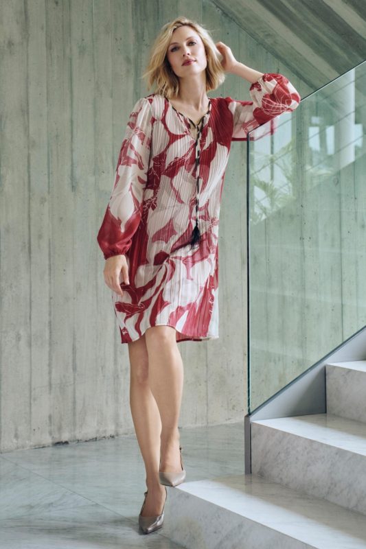 Baskılı elbise, V yaka, kısa kollu.