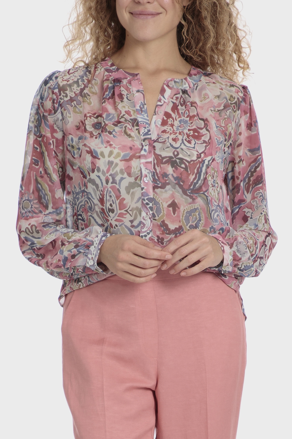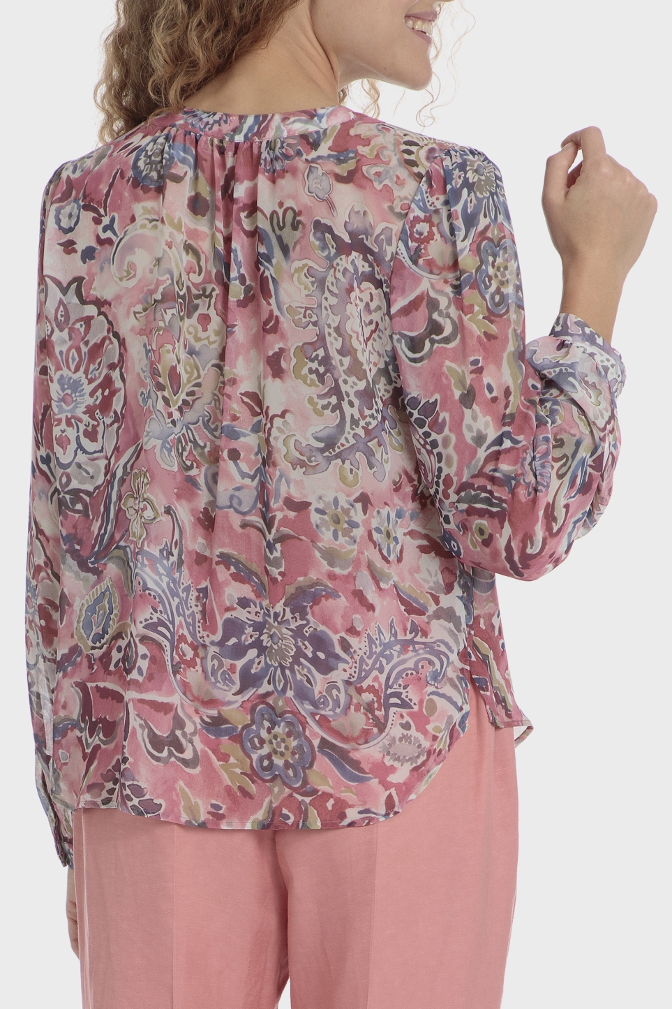 Baskılı gömlek, yan yırtmaçlar, yuvarlak yaka, düğmeli manşetli uzun kollu, önden düğmeli kapama.