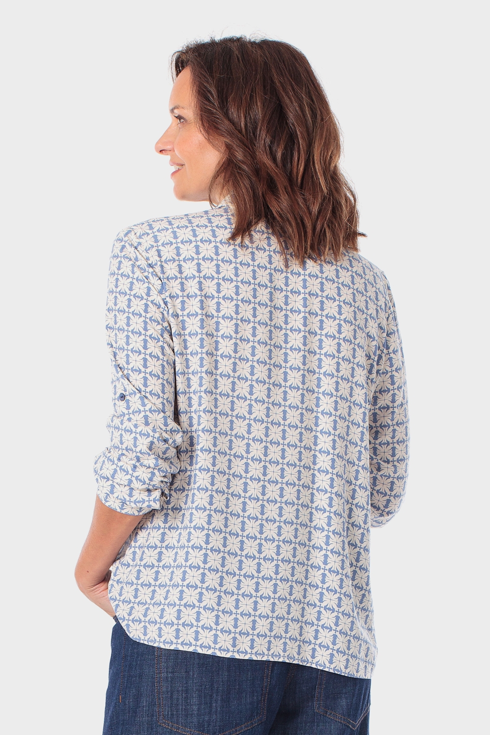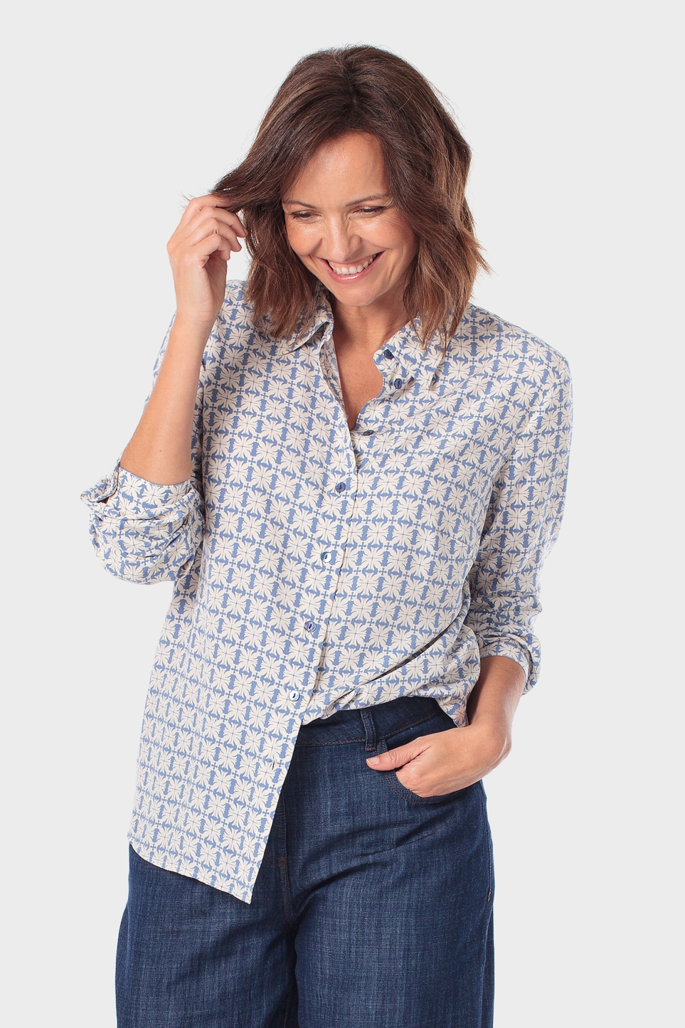 Baskılı gömlek, uzun kollu, düğmeli manşetli, önü düğmeli kapanışlı.