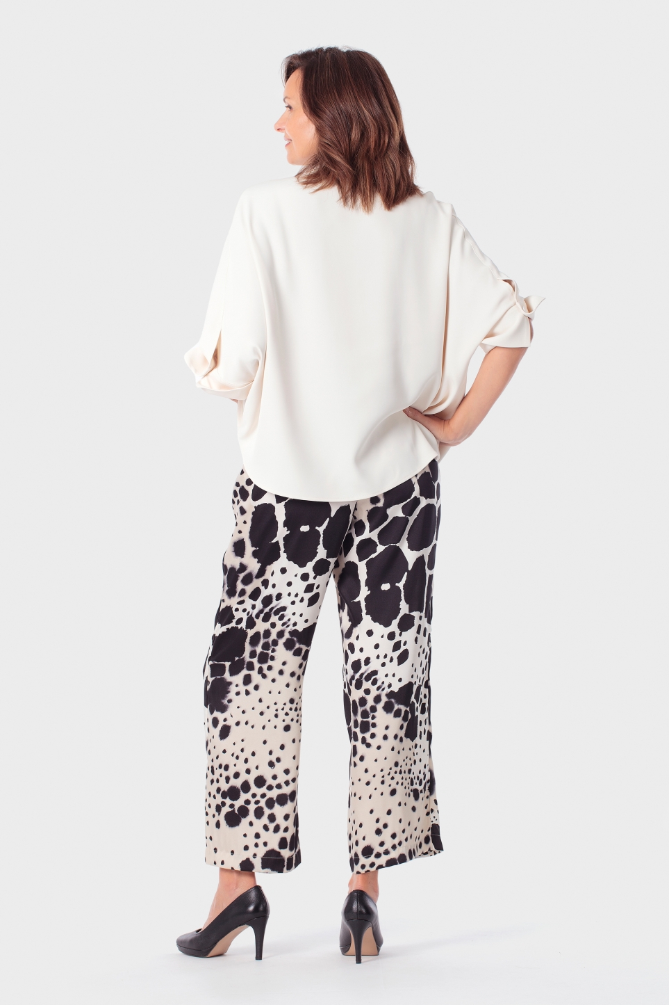 Bej renkli gömlek, ön cep, yan yırtmaçlar, yarasa kollu.