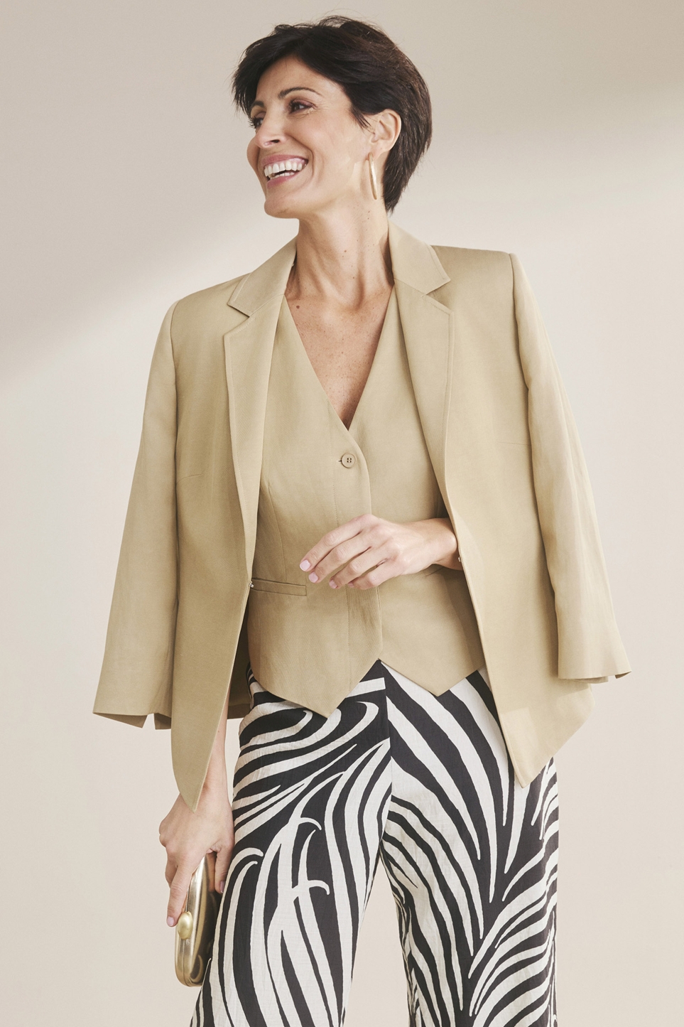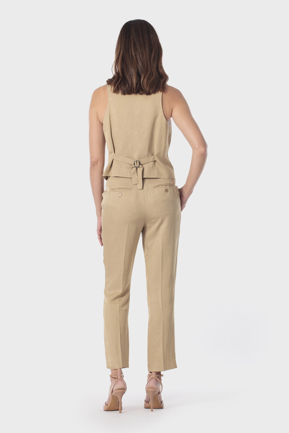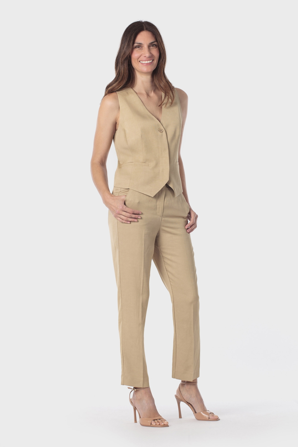 Bej renkli yelek, iki ön cep, tokalı ayarlanabilir arka askılar, düğmeli kapanış.