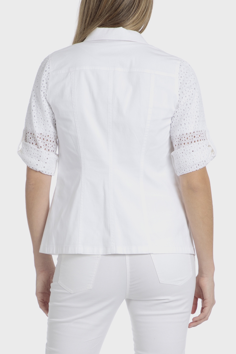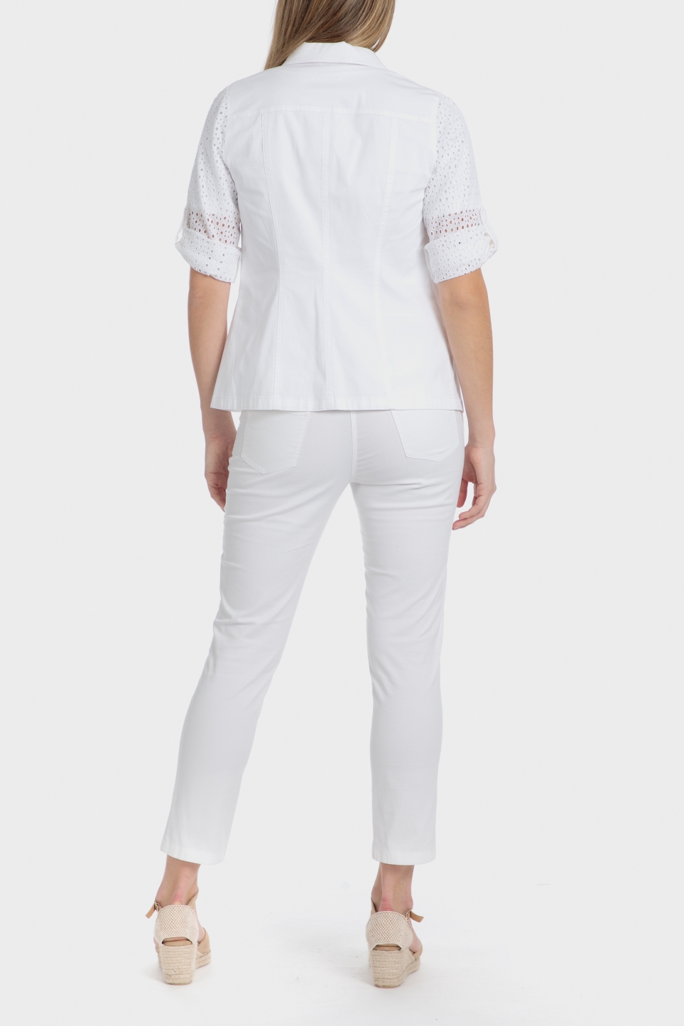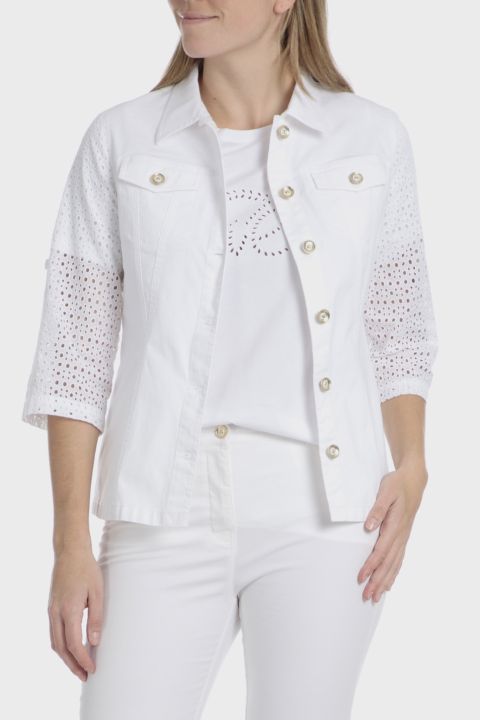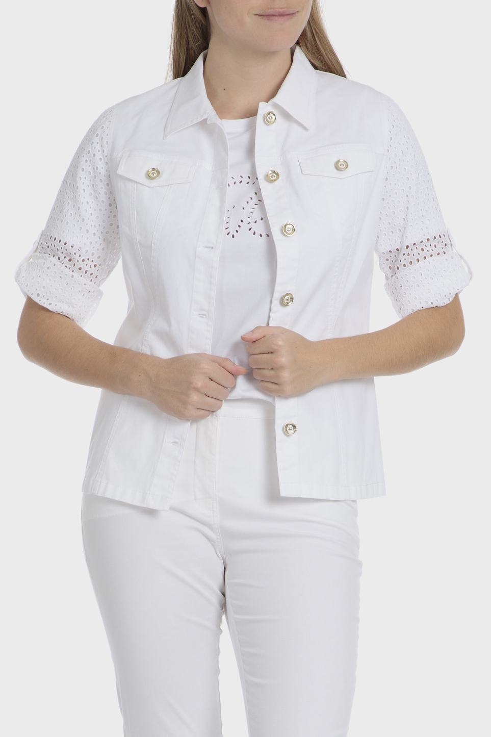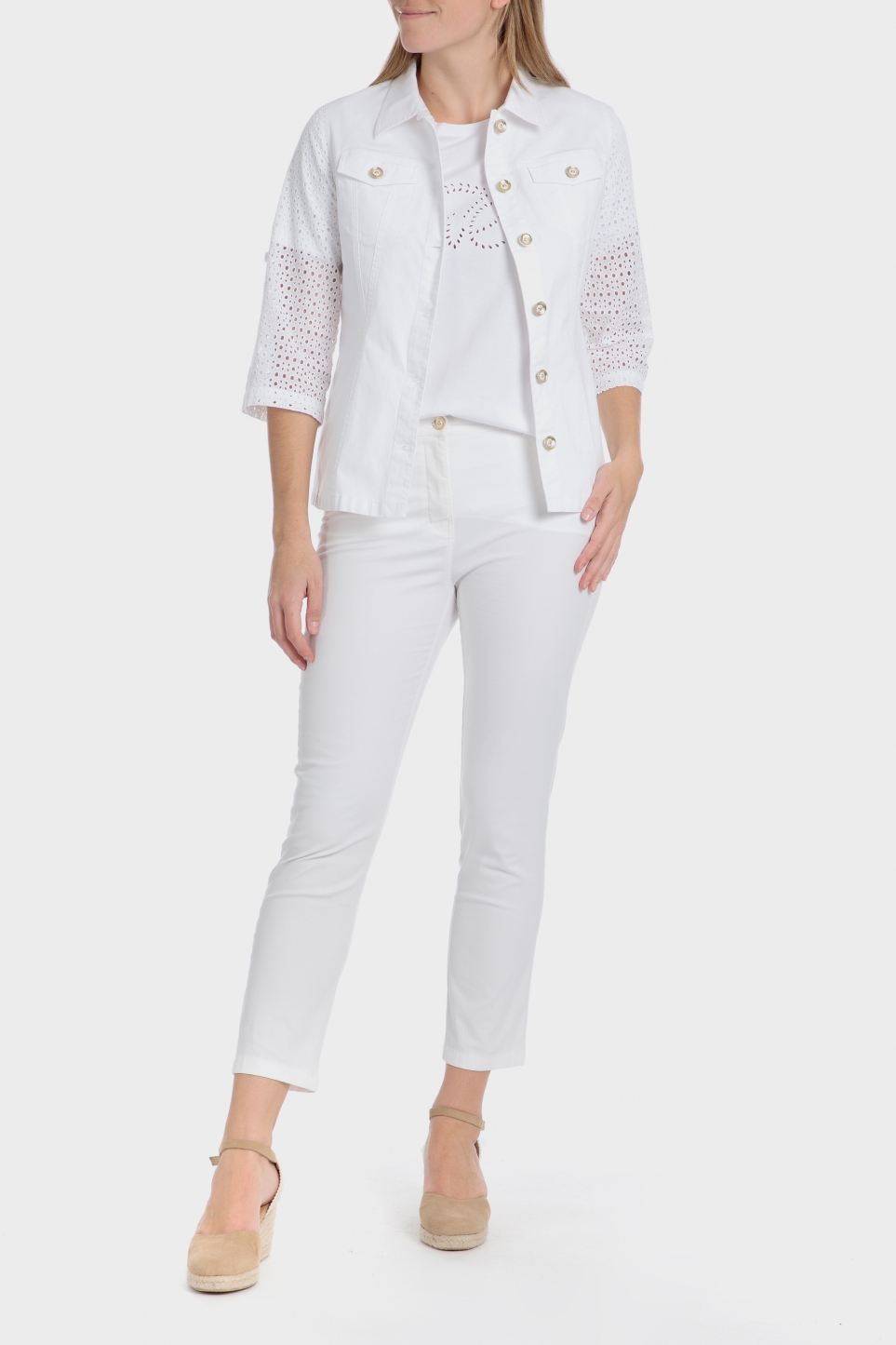 Beyaz ceket, iki ön cep, işlemeli detaylar, önden düğmeli kapama.