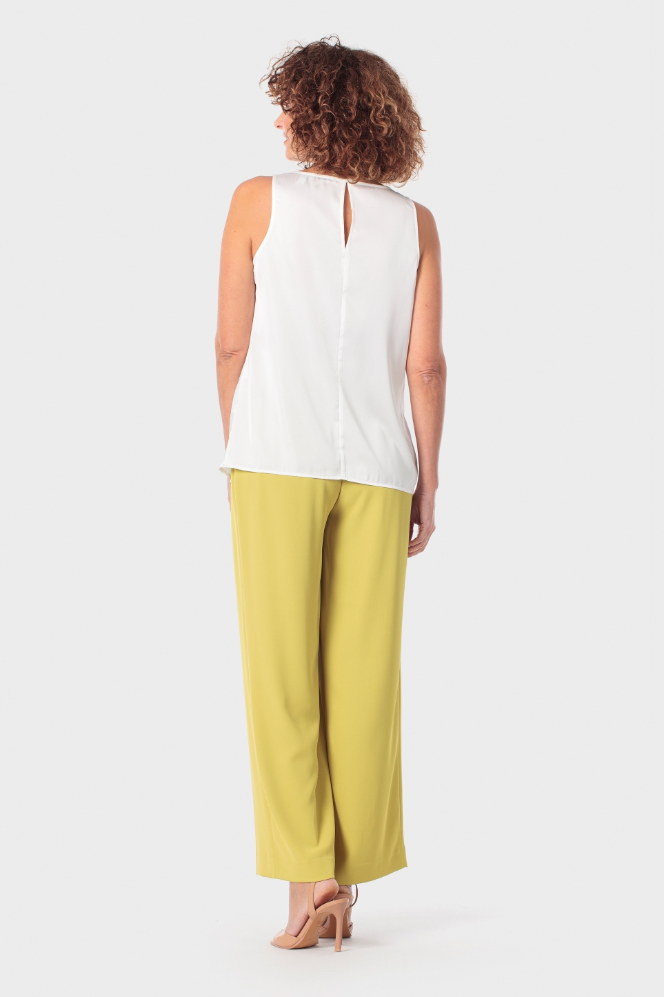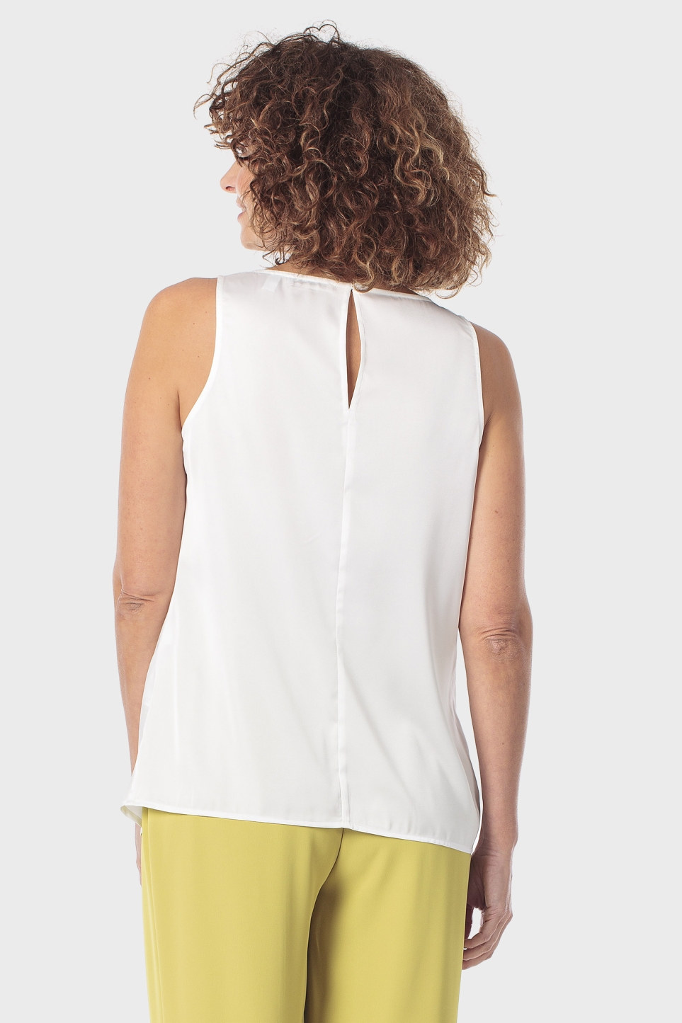 Beyaz bluz, V yaka, kolsuz, arkadan düğmeli.