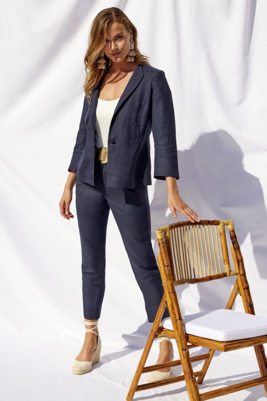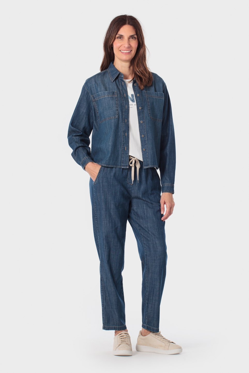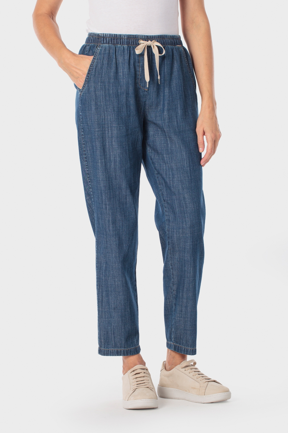 Kot kumaşından yapılmış pantolon, dört cep, lastikli bel, büzgülü bel.
