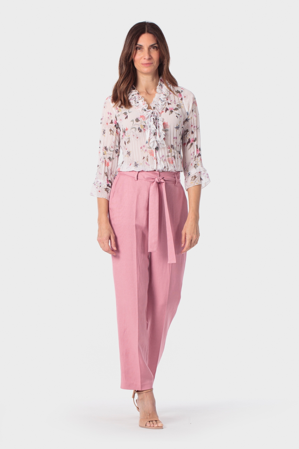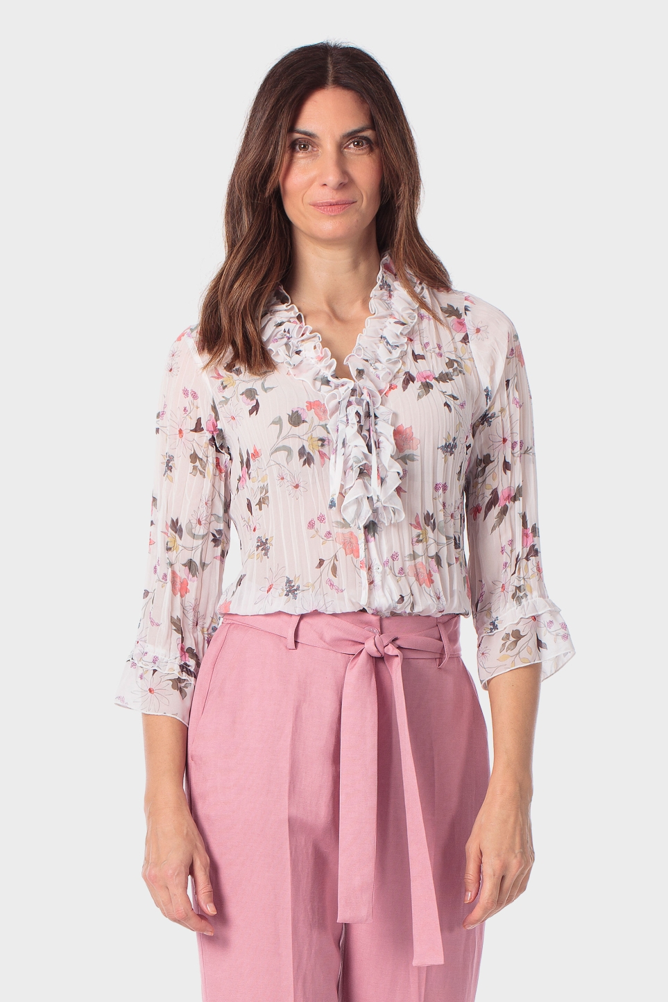 Pileli gömlek, çiçek desenli, fantezi detaylar, önden düğmeli kapama, 3/4 kollu.