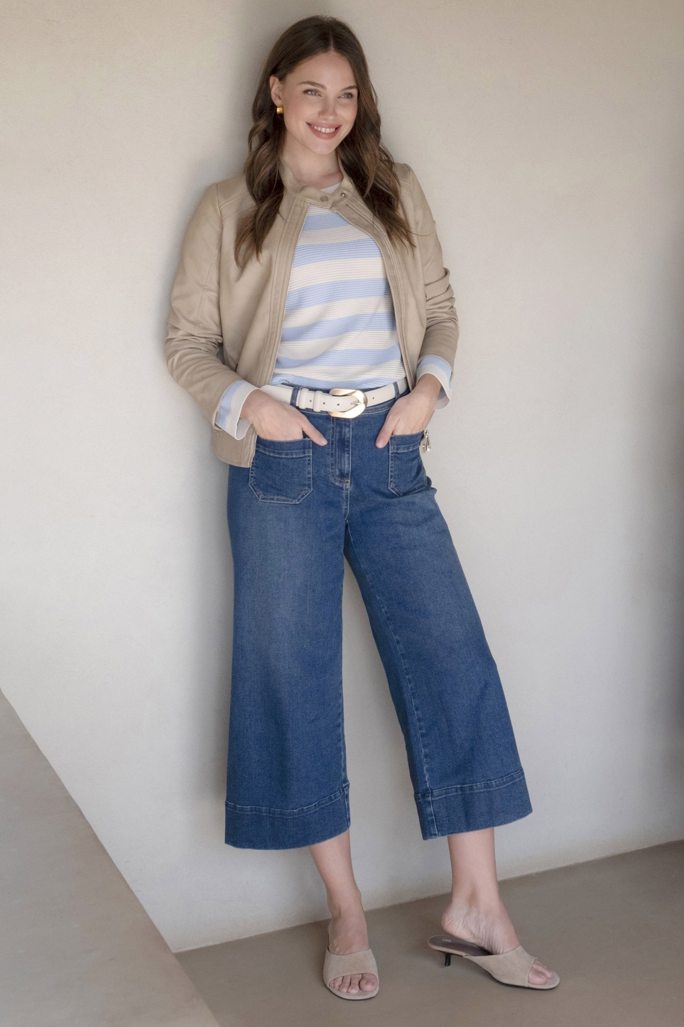 Bol paçalı kot pantolon, dört cep, kemer köprüleri, fermuar ve düğme kapatma.