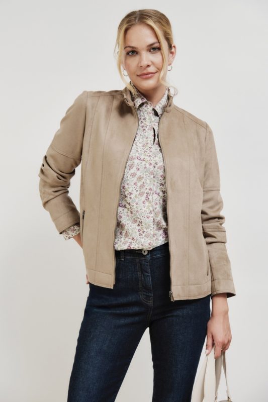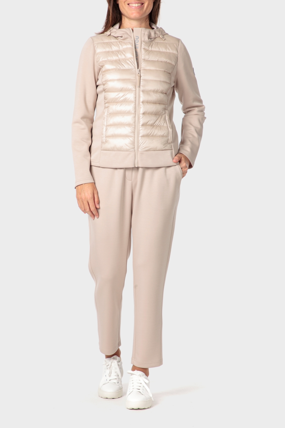 Dolgulu mont, kontrast dokular, iki açık yan cep, ayarlanabilir bağcıklı kapüşon, ön fermuar kapatma.