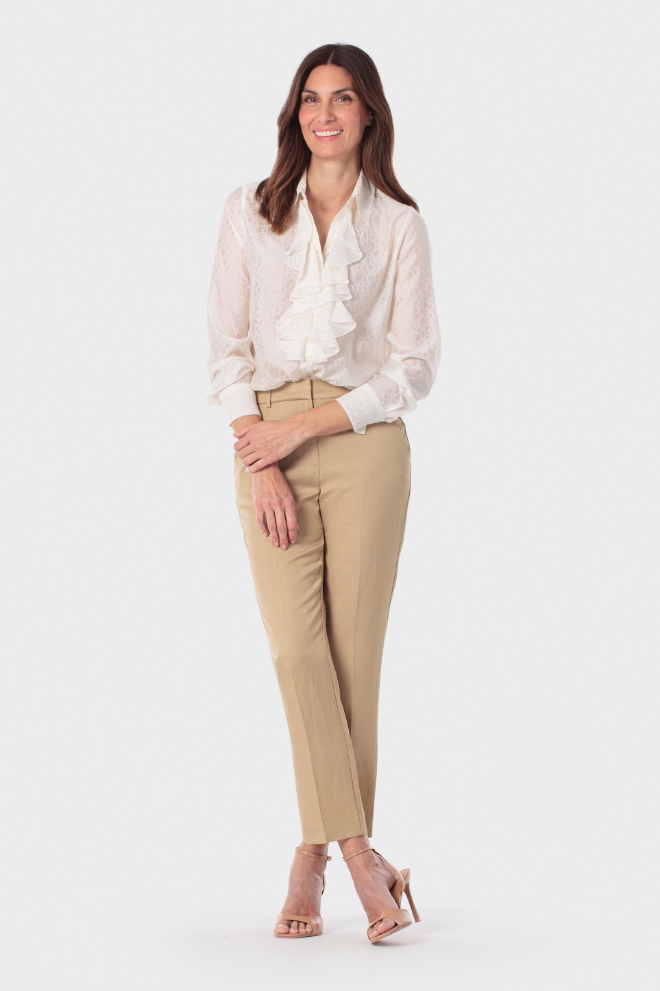 Beyaz gömlek, fantezi detaylar, düğmeli manşetli uzun kollu, önden düğmeli kapama.