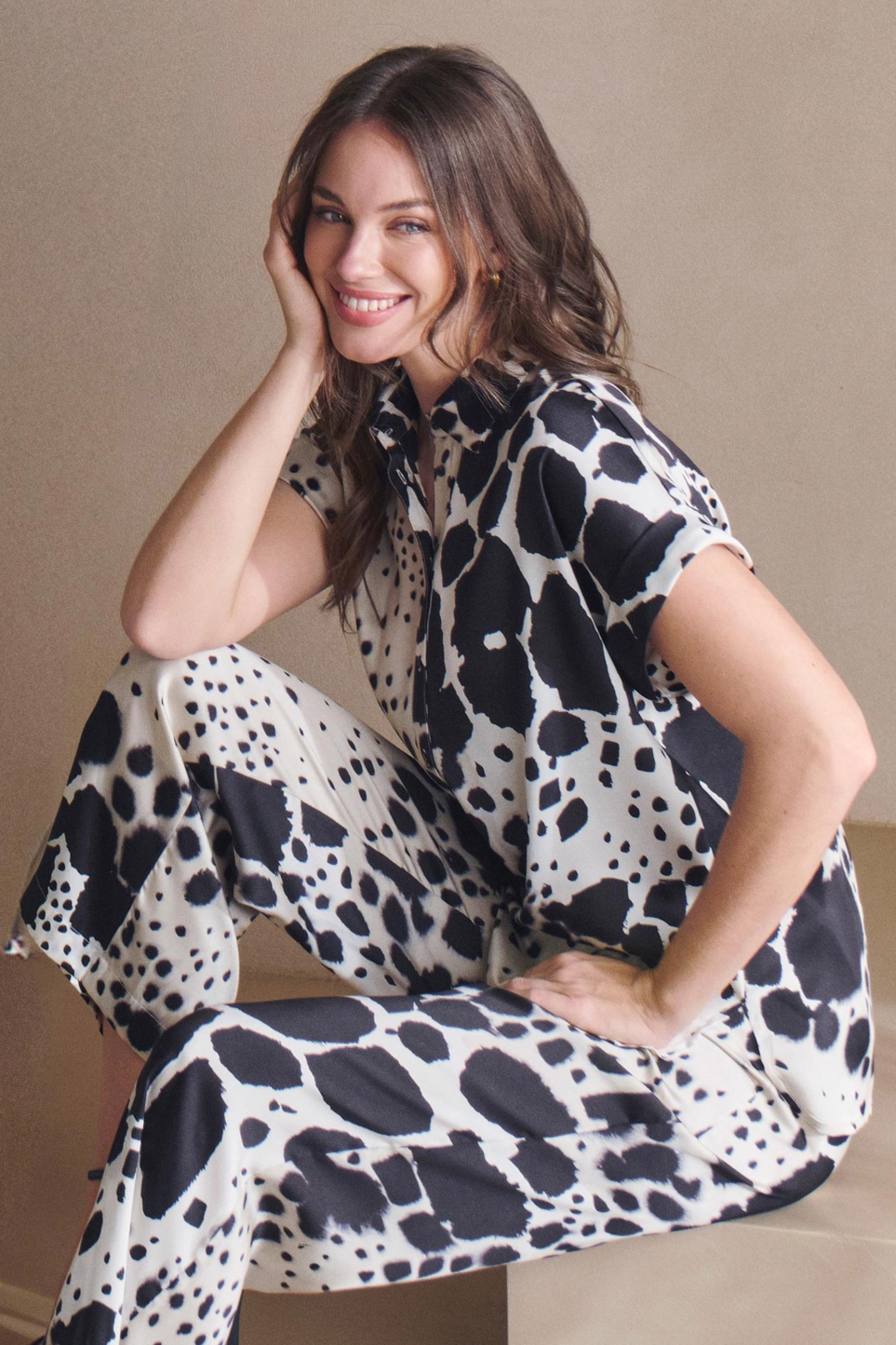 Hayvan desenli gömlek, kısa kollu, önü düğmeli.