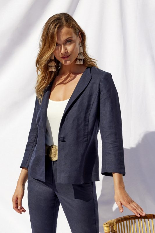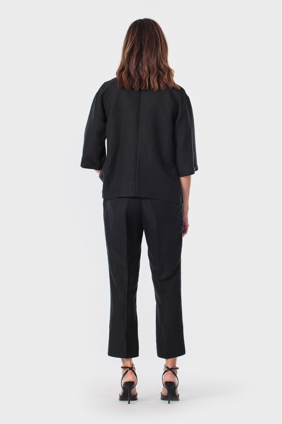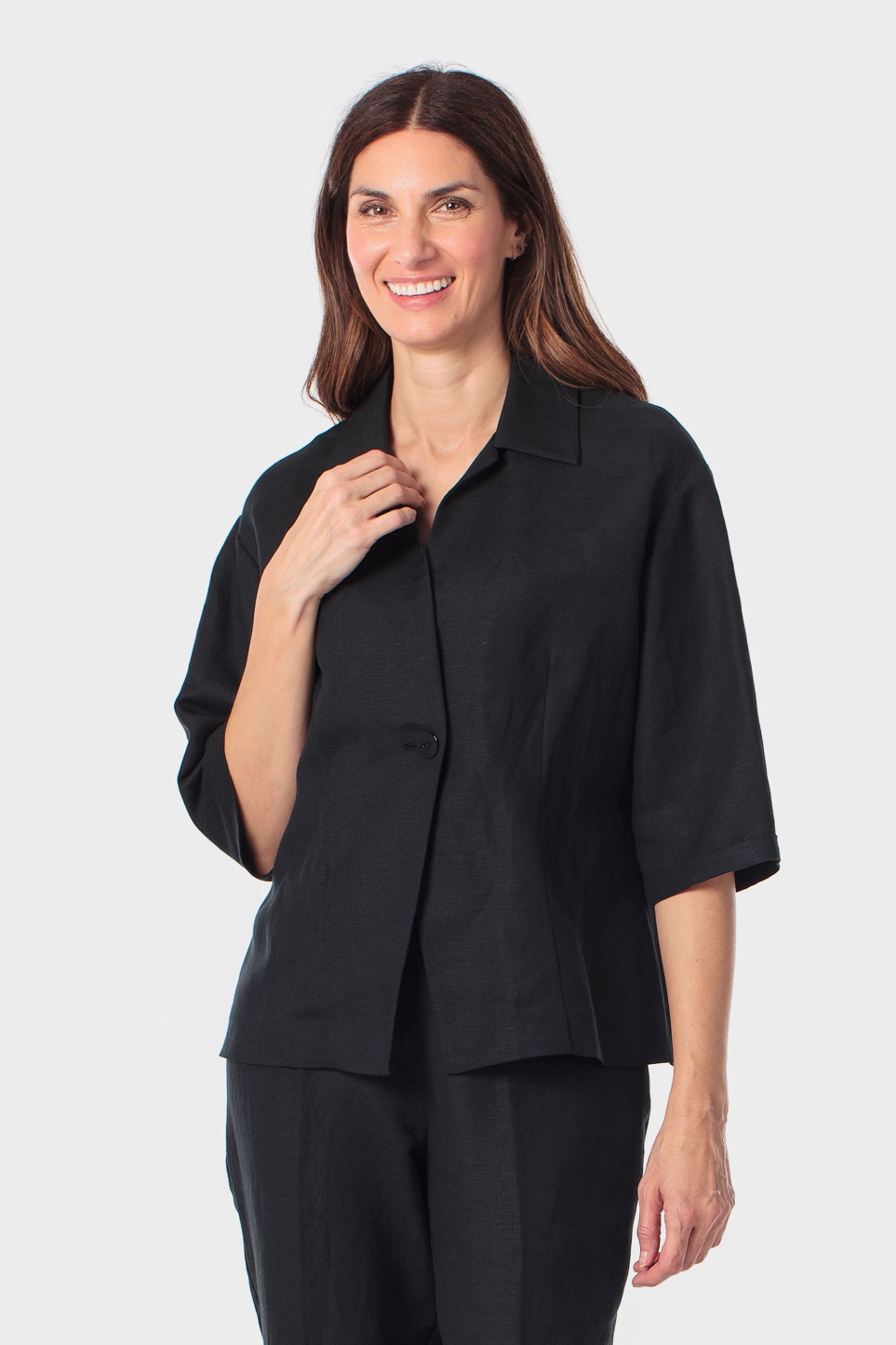 Siyah ceket, keten kumaş, 3/4 kollu, düğmeli kapanış.