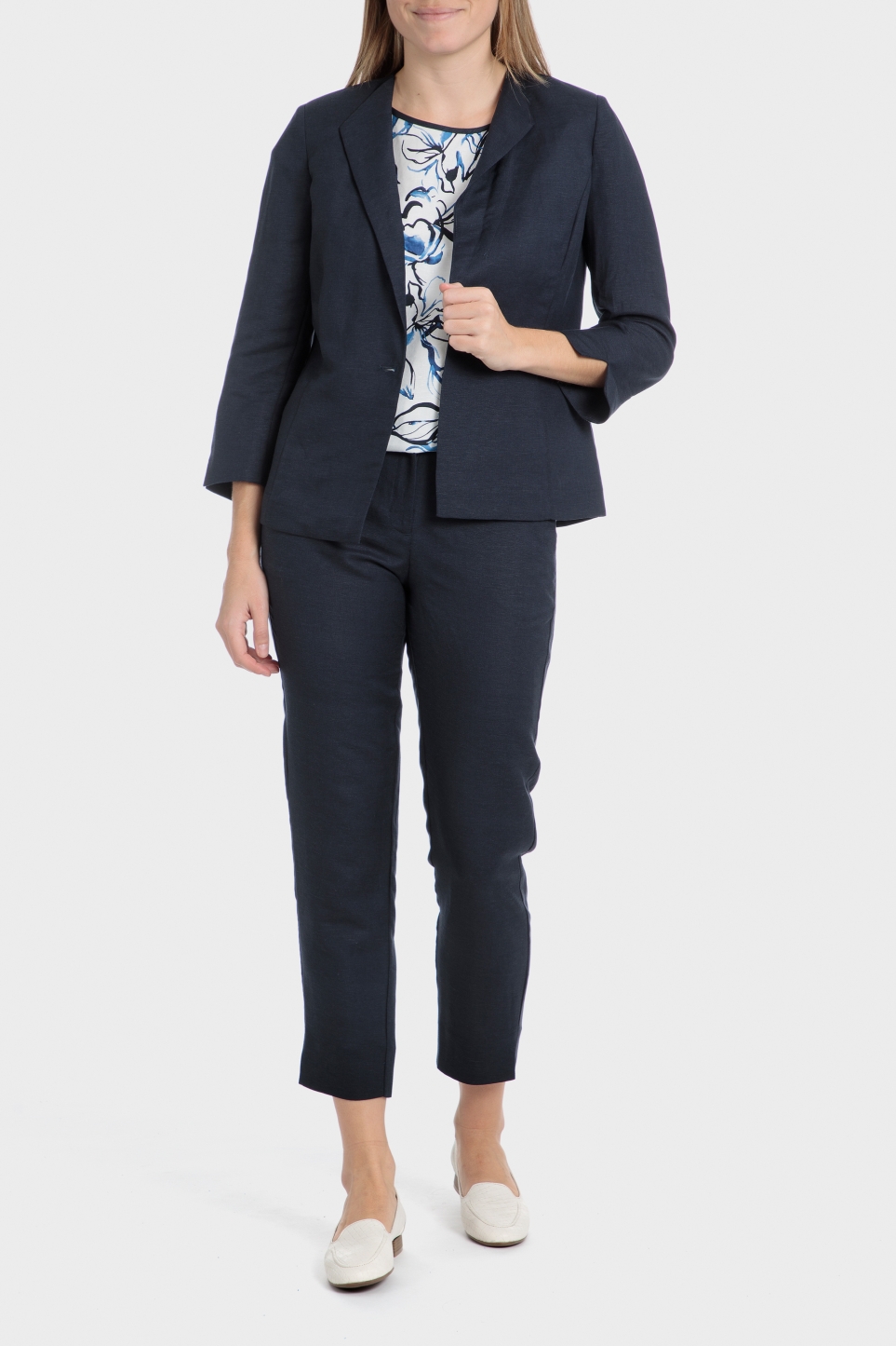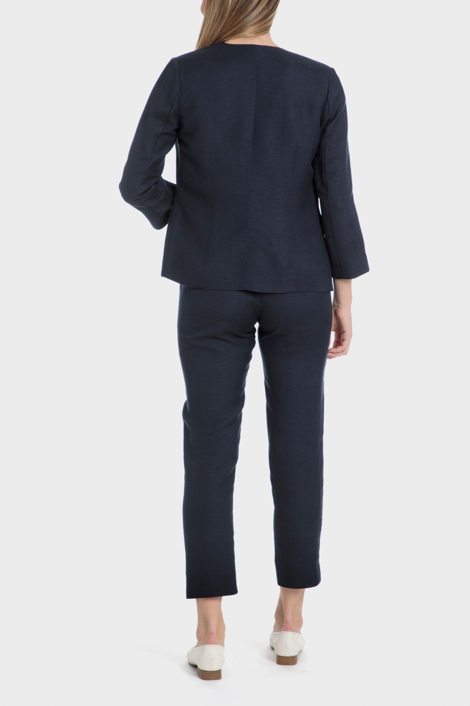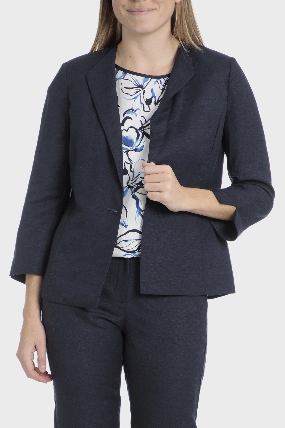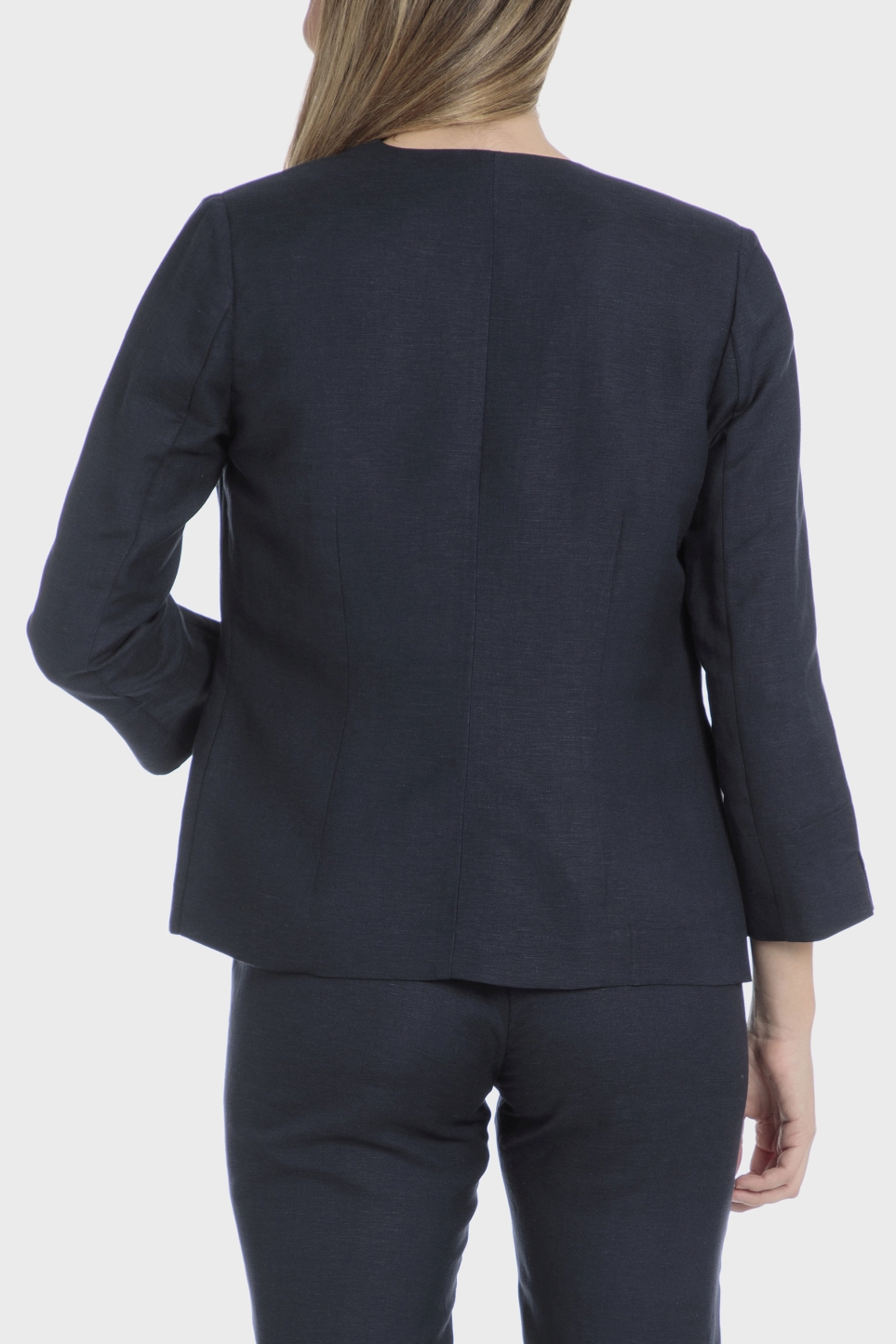 Lacivert blazer ceket, 3/4 kollu, açık manşetli, önü düğmeli. Takımınızı tamamlamak için ceket ve pantolonu birlikte giyebilirsiniz.