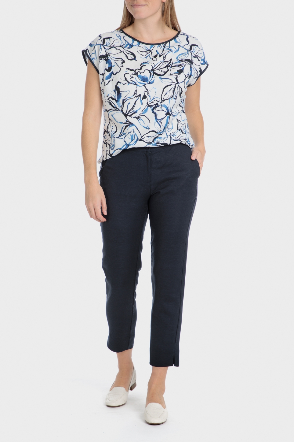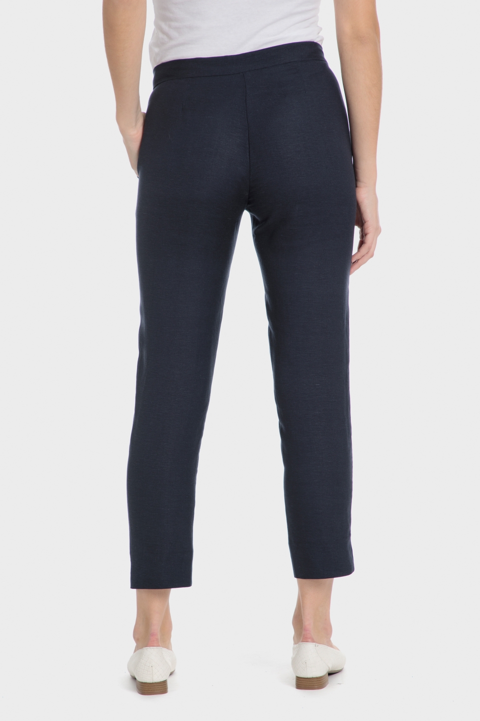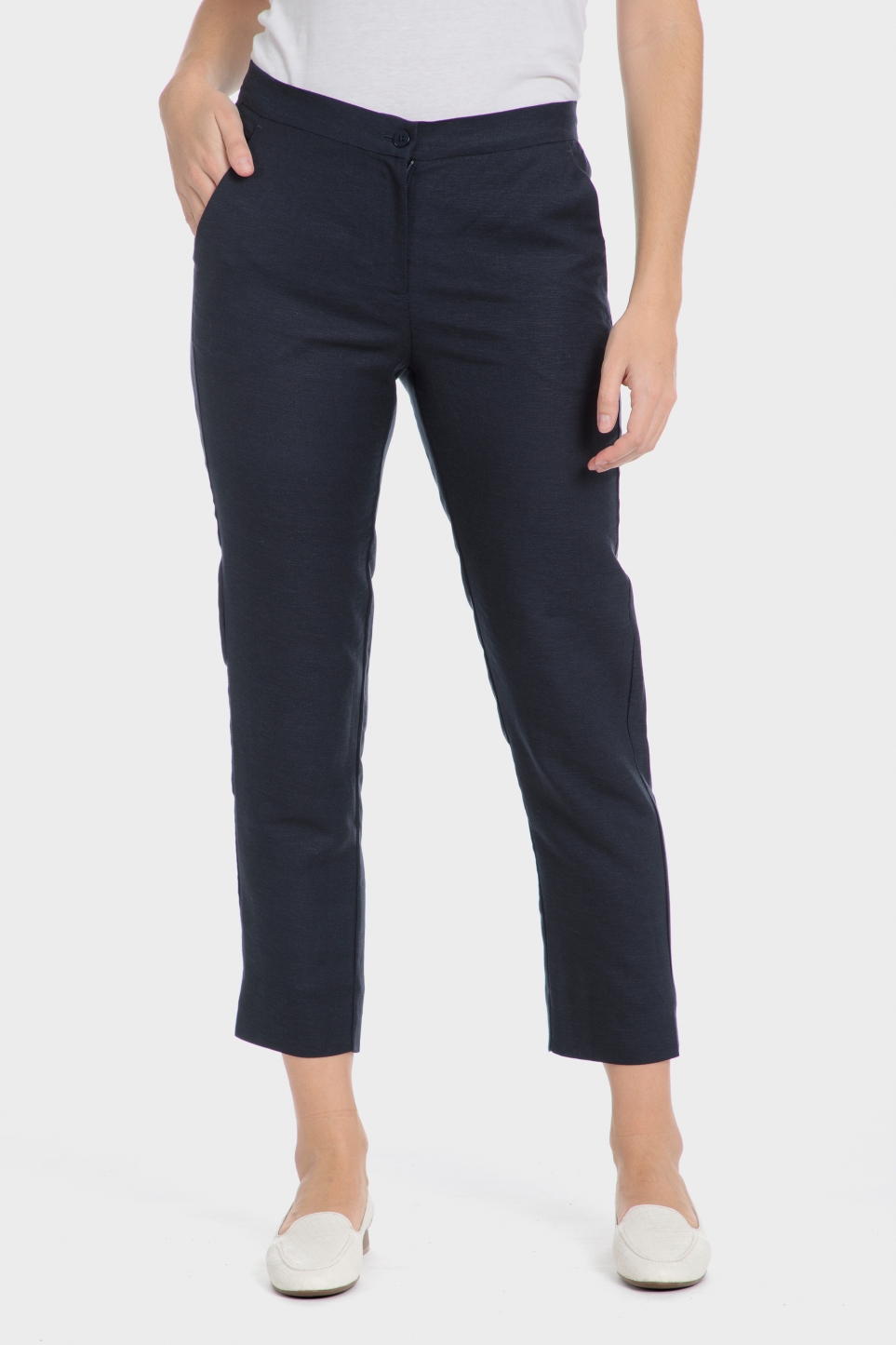 Keten pantolon, lacivert renk, iki açık yan cep, fermuar ve düğme kapama, takım elbisenizi uyumlu ceketle tamamlayın.