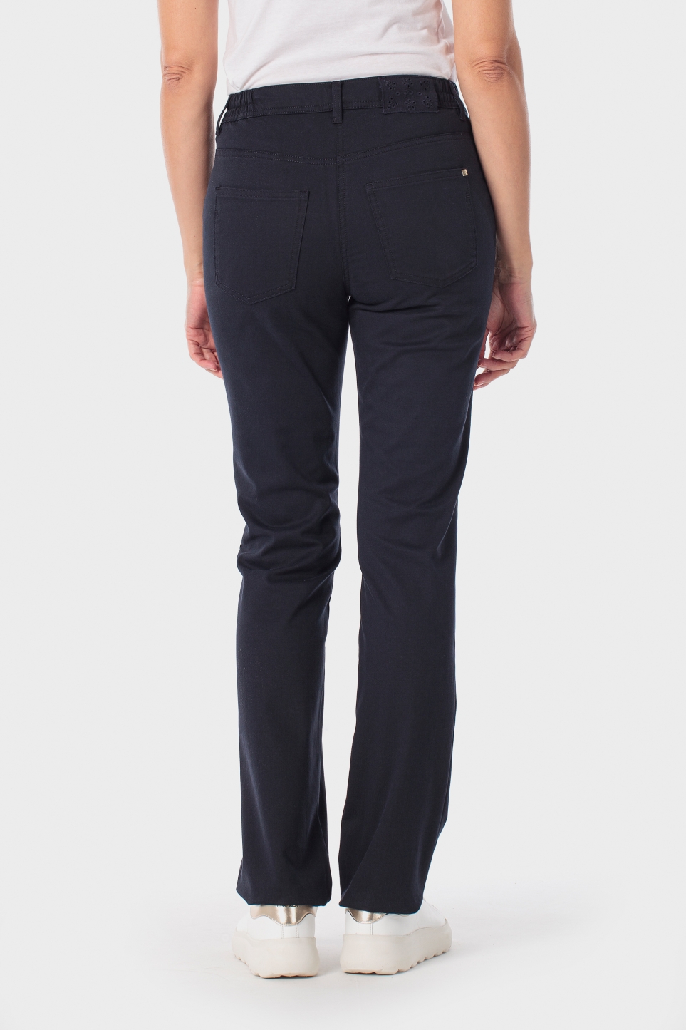 Pamuklu pantolon, dört cep, kemer köprüleri, lastikli bel, fermuar ve düğme kapama, çeşitli renklerde mevcuttur.