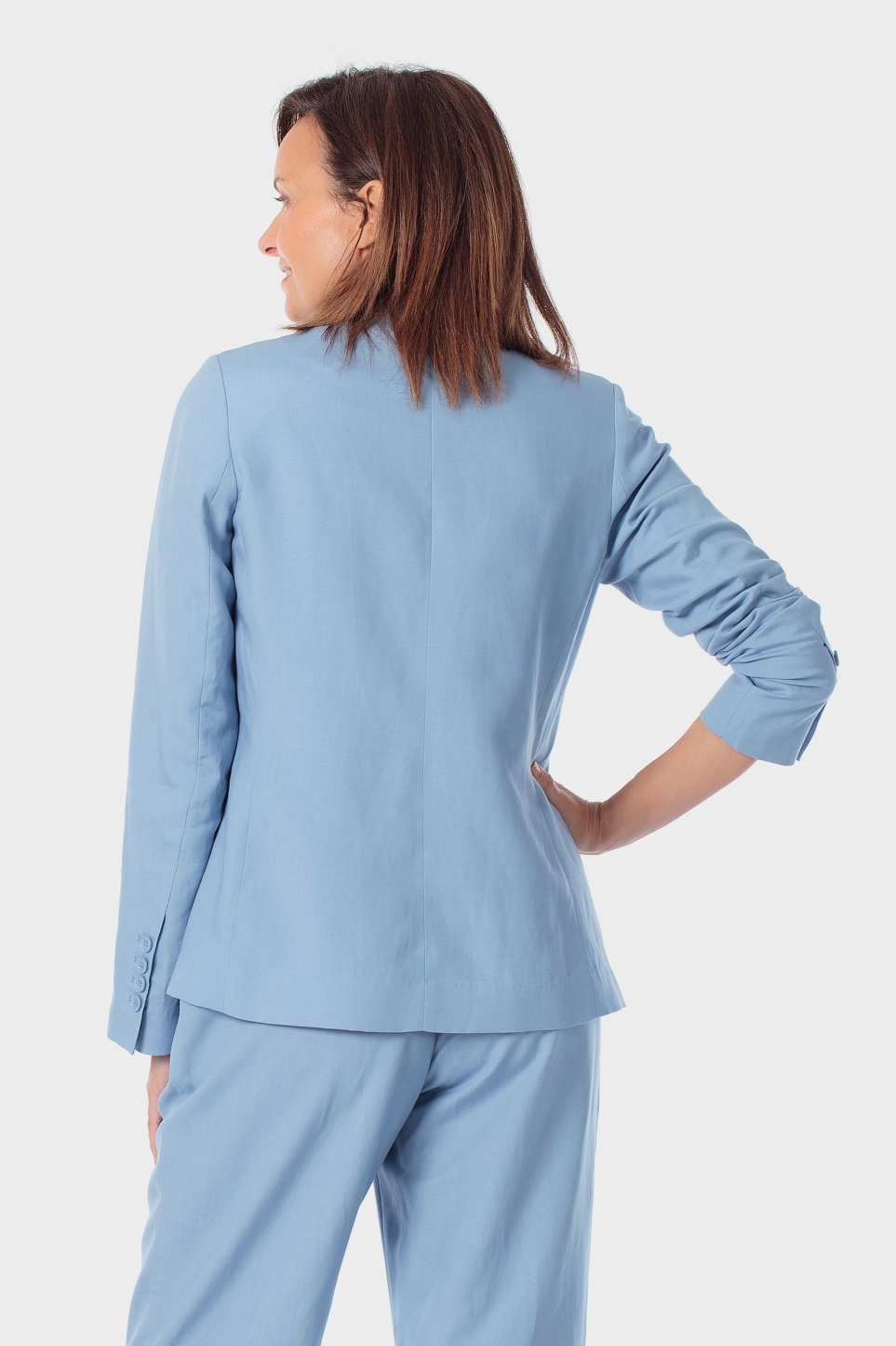 Mavi blazer ceket, iki cep, düğmeli kapama, düğmeli manşetli uzun kollu.