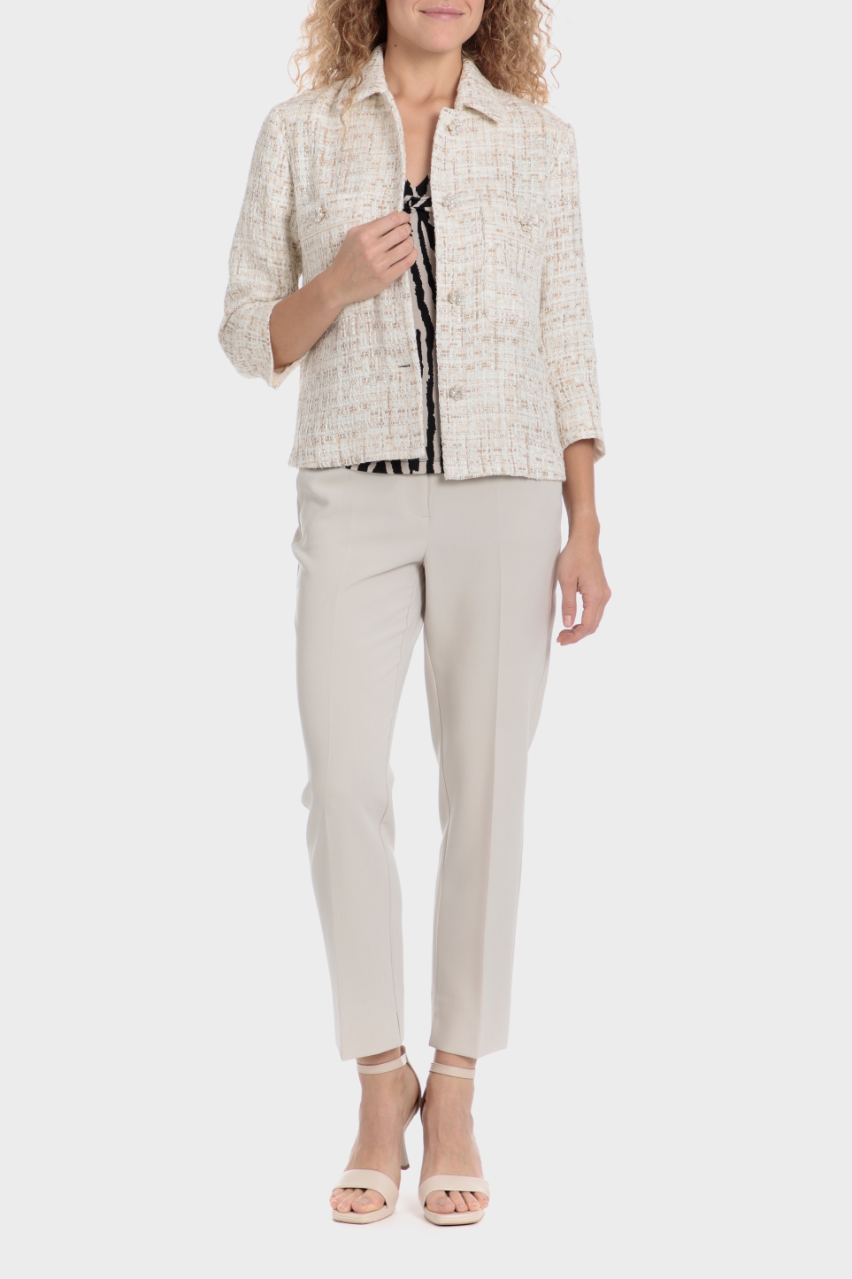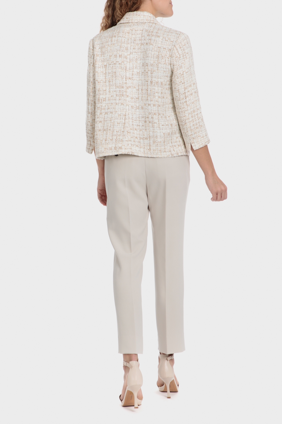 Metalik iplikten yapılmış ceket, dekoratif düğmeler, iki ön cep, uzun kollu, önden düğmeli kapama.