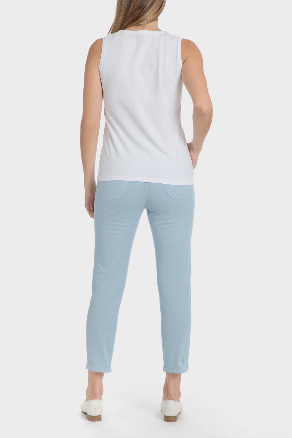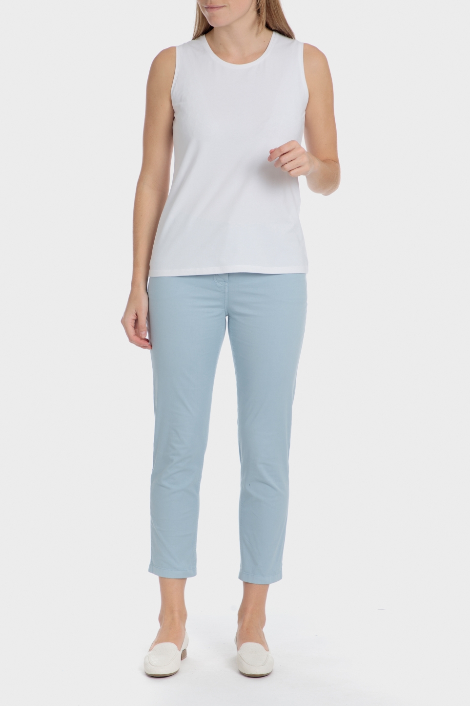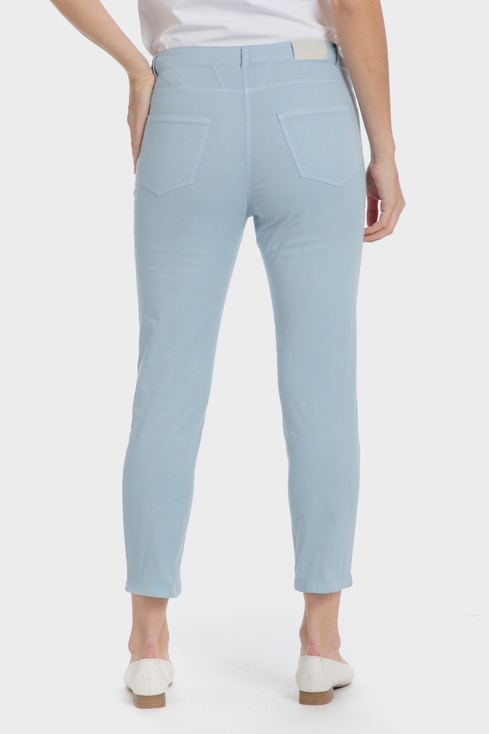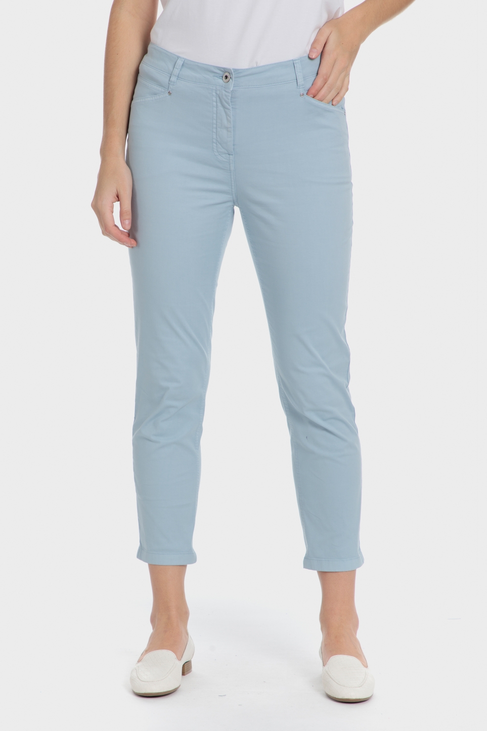 Pamuklu pantolon, dört cep, kemer halkaları. Çeşitli renklerde mevcuttur.
