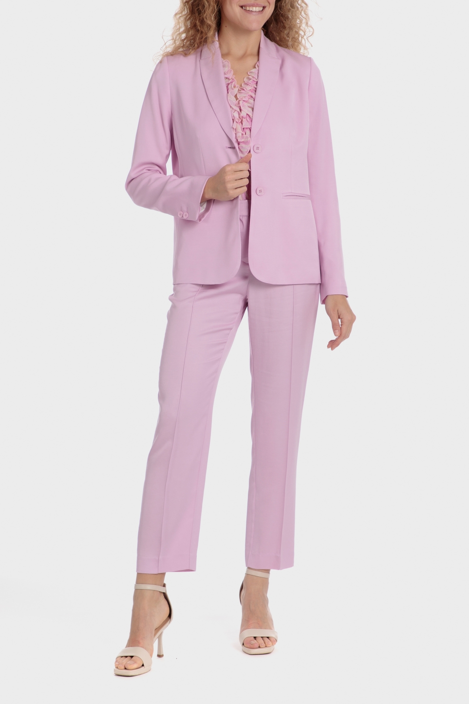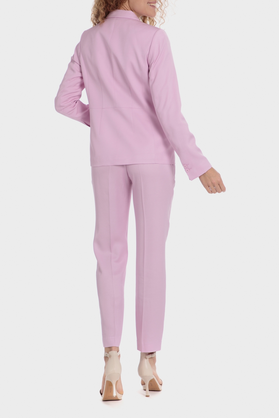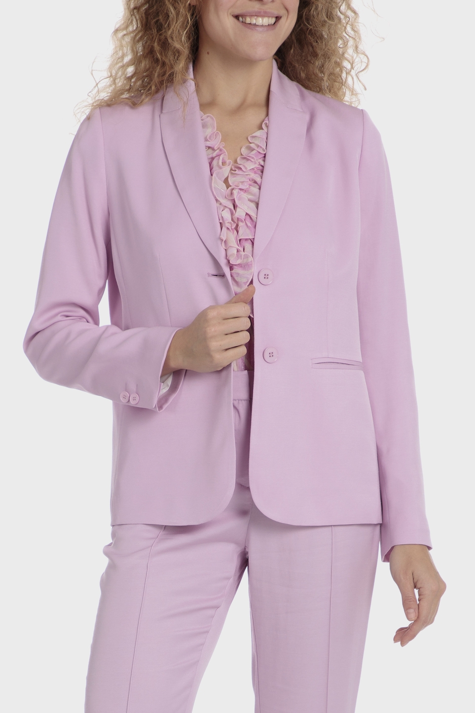 Pembe blazer ceket, iki ön cep, uzun kollu, önden düğmeli kapanış; takım elbisenizi uyumlu pantolon ve ceketle tamamlayın.