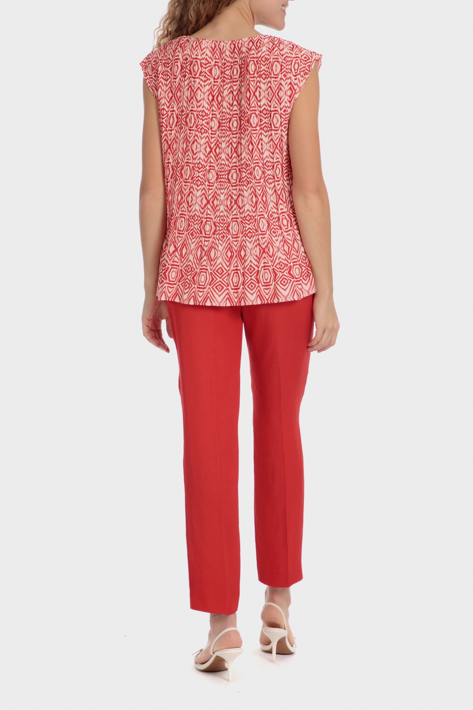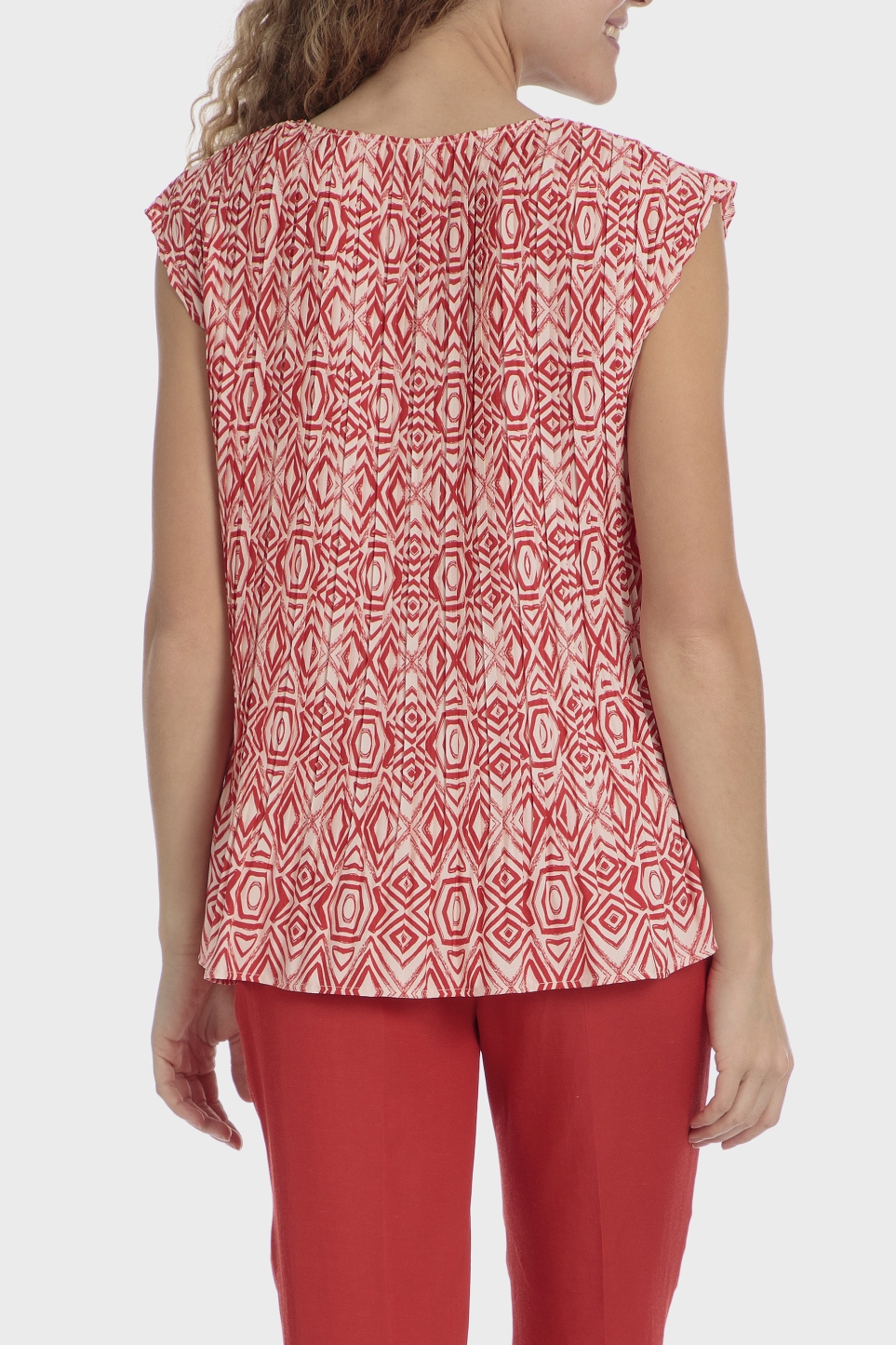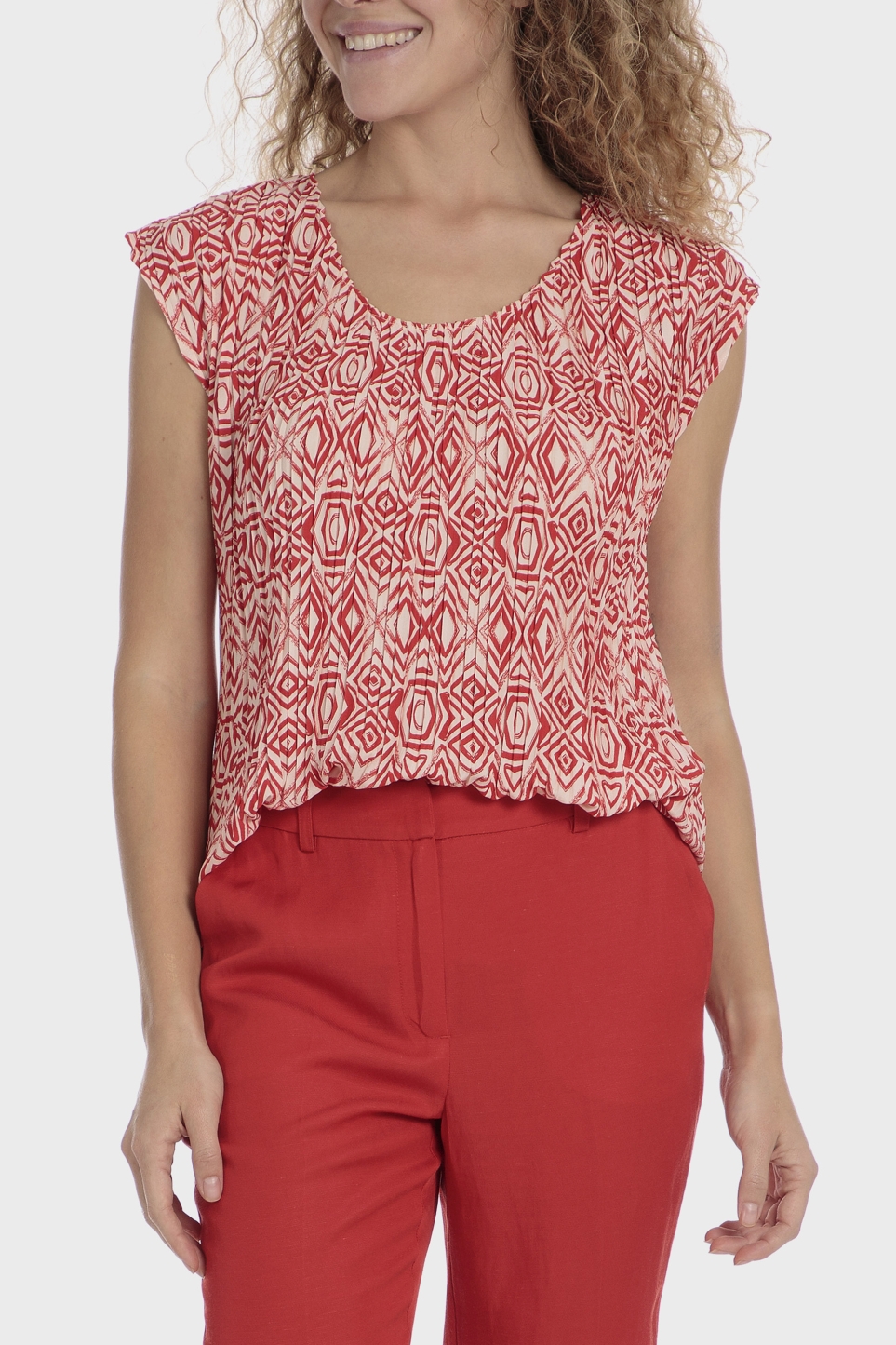 Pileli bluz, geometrik desen, yuvarlak yaka, kısa kollu.