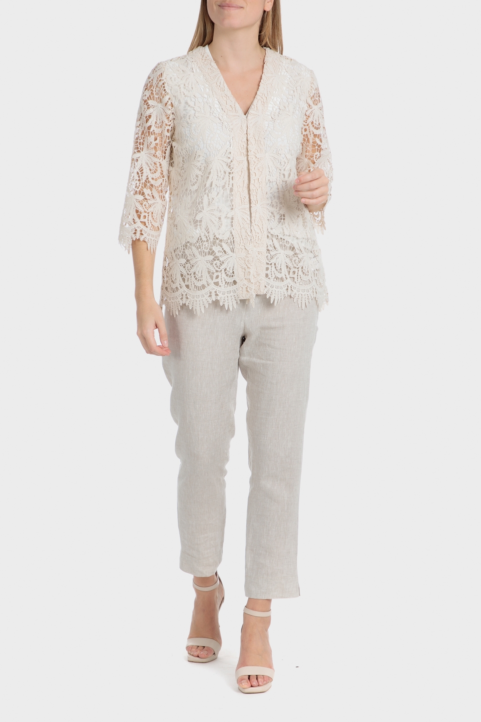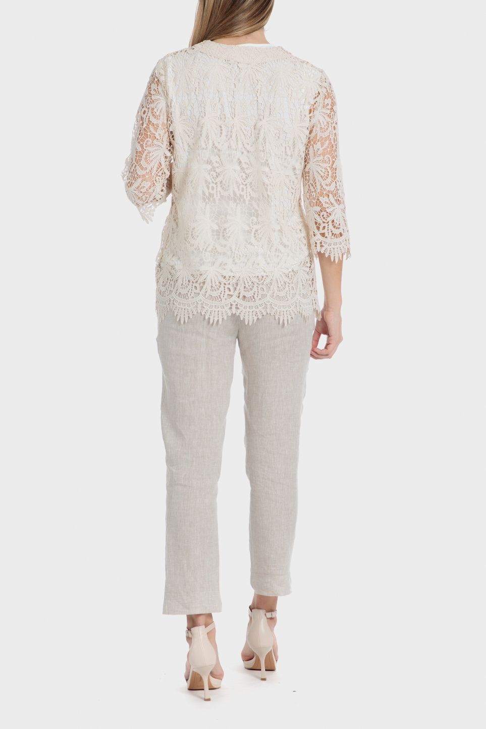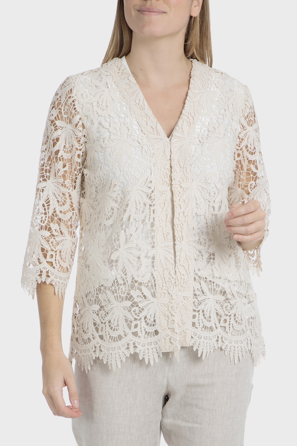 Örgü ceket, bej renkli, 3/4 kollu, kanca ve ilik kapamalı.