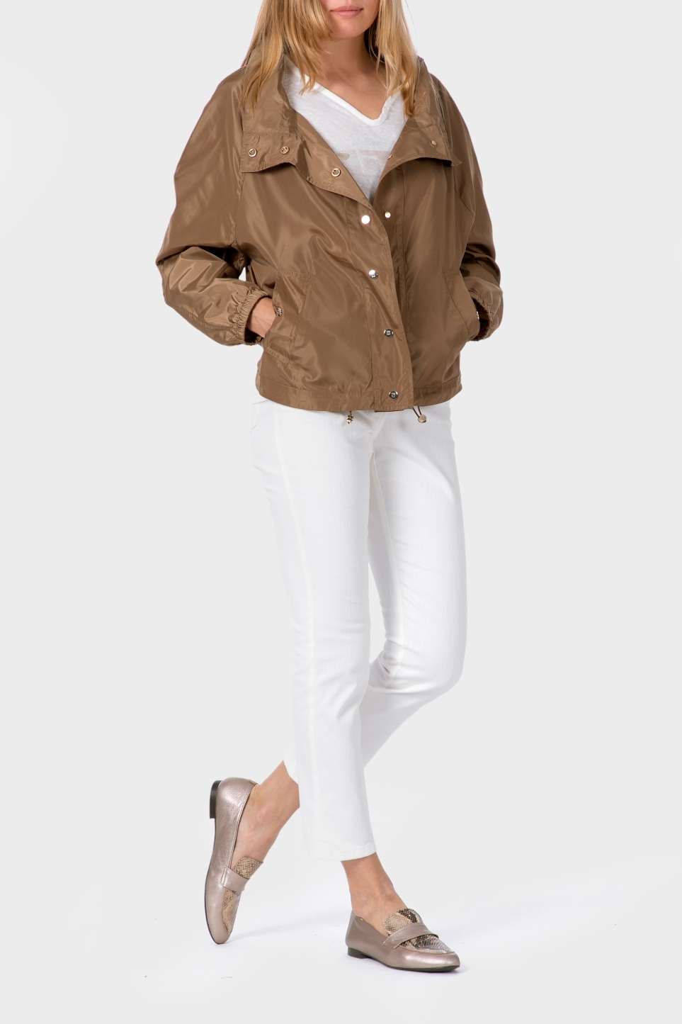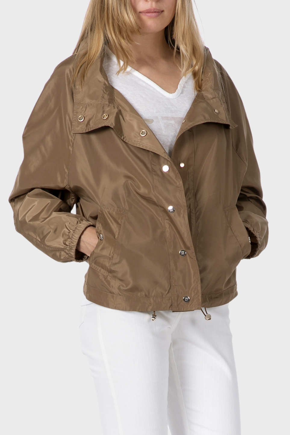 Trenç mont, iki yan cep, ayarlanabilir bağcıklı dik yaka, elastik manşetlerle tamamlanan uzun kollar, altta ayarlanabilir bağcık, ön düğme kapatma.